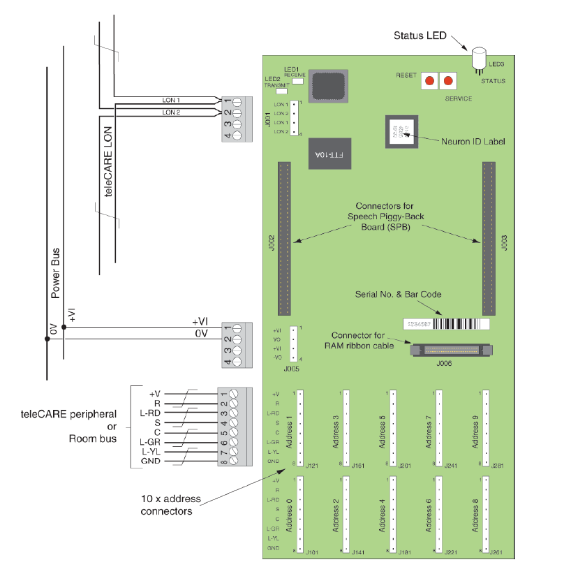 Le système teleCARE M est construit sur un Réseau d’Exploitation Local (LON) qui connecte tous les composants du système à l’aide d’un simple câble à paire torsadée. Considérez-le comme une autoroute de communication intelligente qui relie les chambres des patients, les postes infirmiers et l’équipement de contrôle.